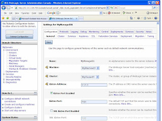 4 MyManaged04 1.1.1.2 7401 N/A falseNotice that, I have created MyAdmin as the WebLogic Admin Server listening on port 7001, two managed servers as MyManaged01 and MyManaged02 listening on ports 7101 and 7201 respectively on WL1 machine (IP: 1.1.1.1). We need to ensure that the combination of IP and port should be unique for all the server processes. Rest of the two managed servers MyManaged03 and MyManaged04 were created on machine WL2 (IP: 1.1.1.2) and made to listen on ports 7301 and 7401 respectively. When all managed servers were created, the server table appeared as shown in figure 8.
